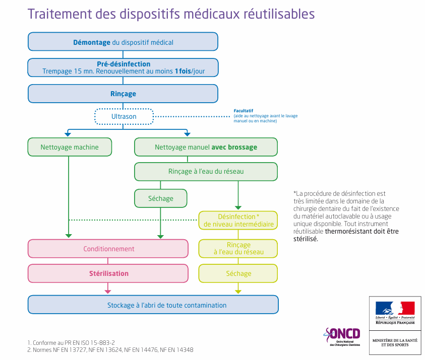 Démarrez d'abord par une stérilisation rigoureuse qui commence dès le fauteuil avec le démontage et la pré désinfection. Et en suivant les étapes tel que mentionnées ci-dessous.